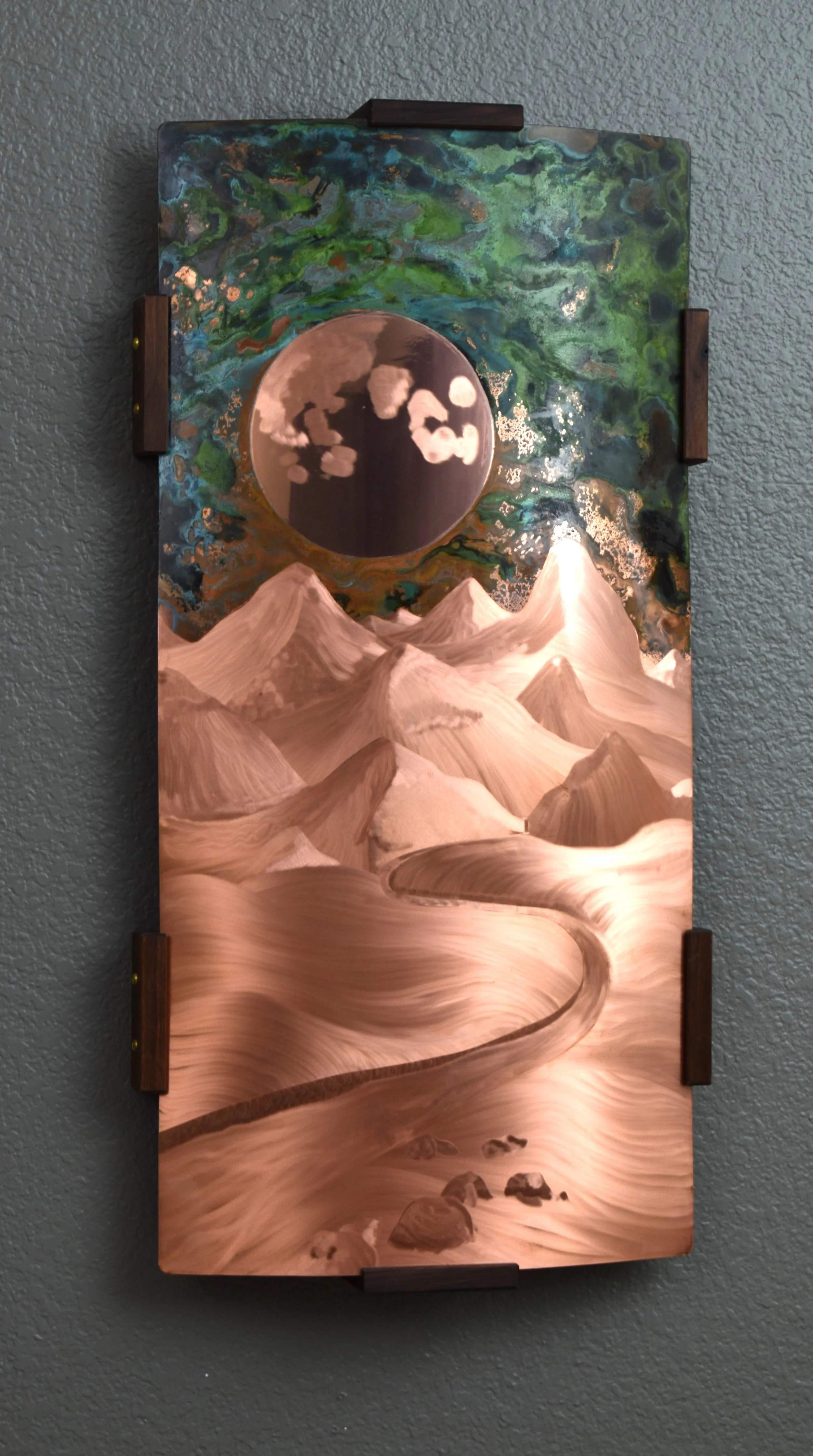 Moon over the Mountains 18" X 36" Salted copper and buffed, this is a capture frame and can be backlit. Call for price.